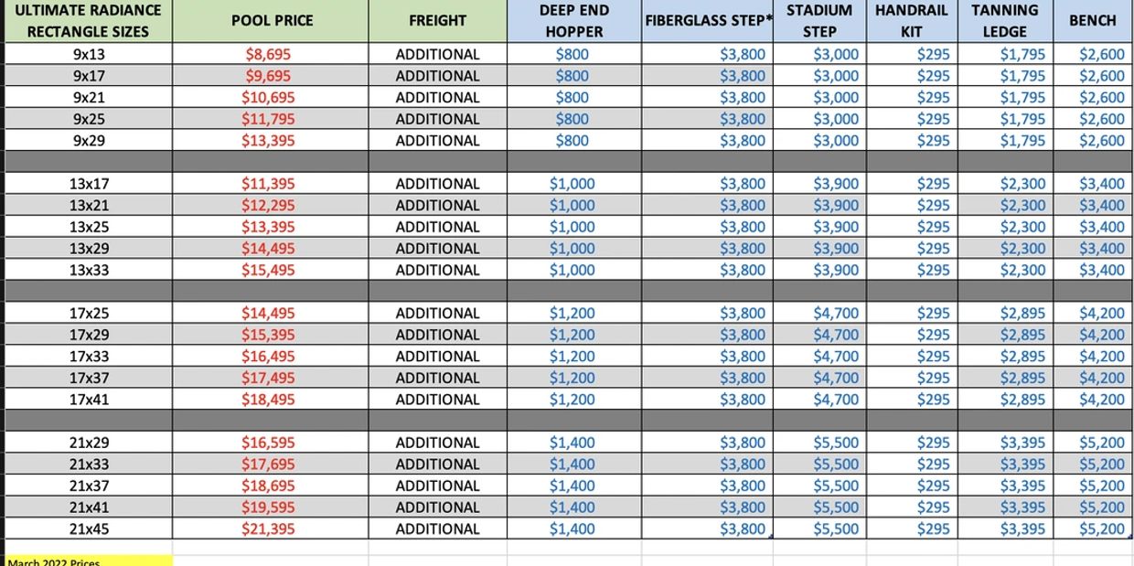 ULTIMATE RADIANCE RECTANGLE #1 IN CUSTOMER SERVICE & TECH SUPPORT BEFORE AND AFTER THE SALE 800 492 0696 DELUXE INGROUND WALK OUT STEP, NEW STADIUM LINER OVER STEP & TANNING LEDGE AVAILABLE AVERAGE INSTALL ULTIMATE RADIANCE NATIONWIDE ON GROUND $3500 TO $4200 SEMI IN GROUND $4900 TO $6200 FULLY BURIED INGROUND $6800 TO $8900 (REQUIRES CONCRETE COLLAR BELOW GROUND OR WITH ANY DEEP END..... NOT INCLUDED ) ADD $1500 SMALL POOL, $2300 MEDIUM POOL, $2700 LARGE POOL FOR ANY TYPE DEEP END INSTALL ABOVE GROUND WITH DEEP END USE SEMI INGROUND RATE PLUS DEEP END COSTS 800 492 0696